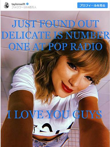 最新シングル「デリケート」が全米のポップラジオチャートで1位を獲得! 2018.07.25 TOPICS 最新シングル「デリケート」が全米のポップラジオチャートで1位を獲得! テイラーはInstagramにて下記の様にコメントしています: 「「デリケート」は自分の人生において心が傷ついていた時について書いた曲なので、その曲が1位を獲得出来たことをとても嬉しく思っています。ファンの皆さんの素晴らしいサポートには驚かされるわ。この全てのことにおいて、私が今“かなりデリケートな気分でいる”って言えると思うわ。みんな愛してる。」