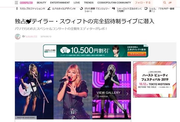 WEBメディア「コスモポリタン」でパリで開催されたスペシャルライブレポートの記事が公開! 2019.09.13 MEDIA - WEB アルバム『ラヴァー』の発表を記念し、フランス、パリの劇場「オランピア」で開催されたスペシャル・ライヴ“City Of Lover”の模様を徹底レポートいただきました! https://www.cosmopolitan.com/jp/entertainment/celebrity/g28977863/taylor-swift-city-of-lover-concert-in-pairs/