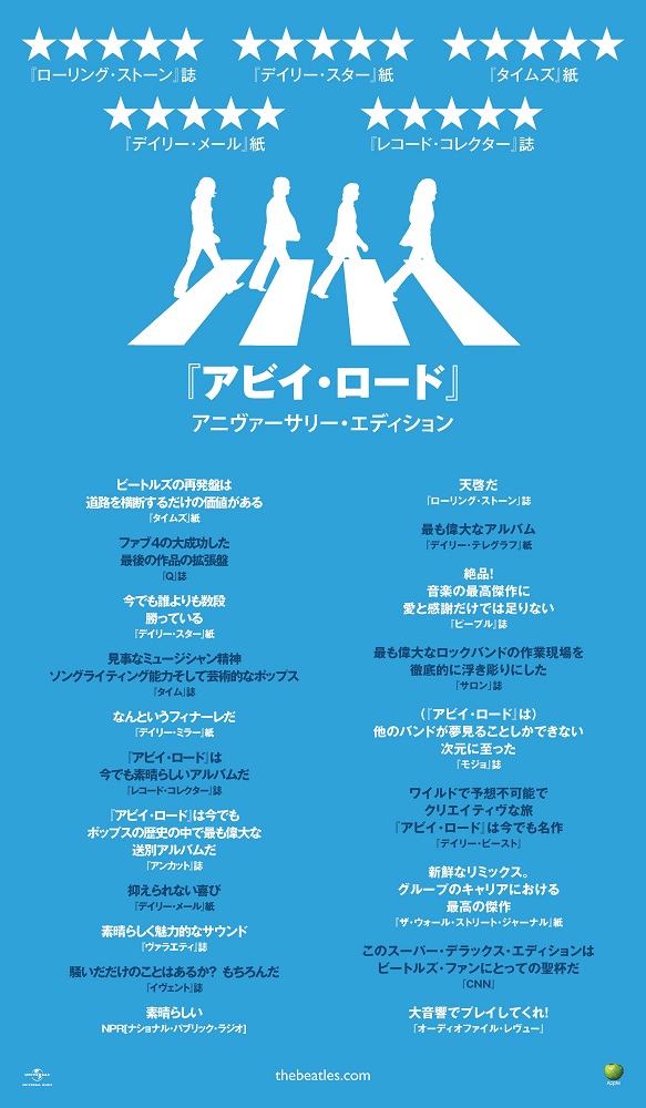 『アビイ・ロード』50周年記念エディション海外レビューの日本語訳を掲載! 2019.10.31 TOPICS 海外の主要音楽誌/サイト等で掲載されたレビューの日本語訳です。 辛口な海外の批評家達にも今回の作品は大絶賛で受け入れられています。