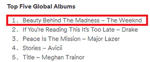 SPOTIFYにて、今年最もストリーミングされたアルバムに! 2015.12.19 TOPICS 世界最大のストリーミングサイトSPOTIFYにて、ザ・ウィークエンドの『ビューティー・ビハインド・ザ・マッドネス』が今年最もストリーミングされたアルバムに!