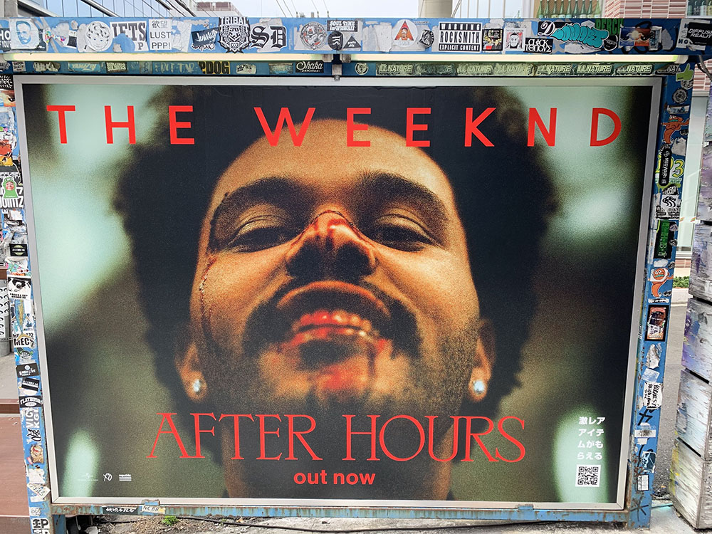 遂に待望のニュー・アルバム『After Hours』を3/20にリリースしたR&Bスーパースター、ザ・ウィークエンド。日本でも話題沸騰中のこの新作リリースを記念し、“顔面流血”で衝撃を与えた『アフター・アワーズ』のジャケット写真を大きくプリントした“巨大顔面看板”が渋谷に出現しました!