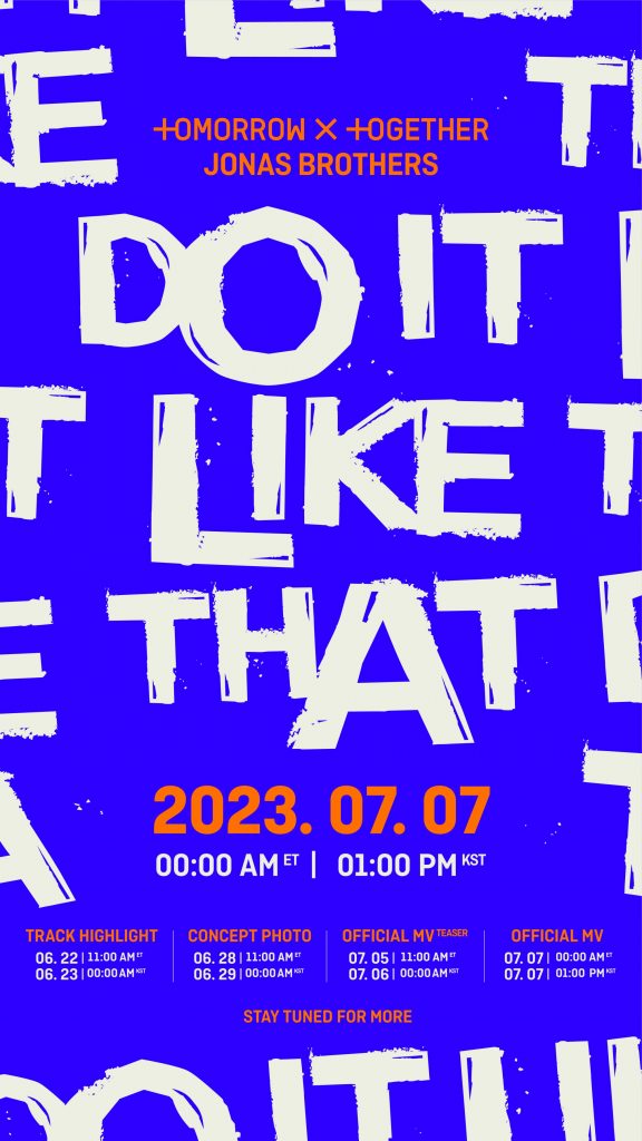 一方、TOMORROW X TOGETHERとジョナス・ブラザーズの新曲「Do It Like That」は7月7日午後1時(韓国時間)グローバル音源ストリーミングプラットホームを通じて全世界に同時公開される。