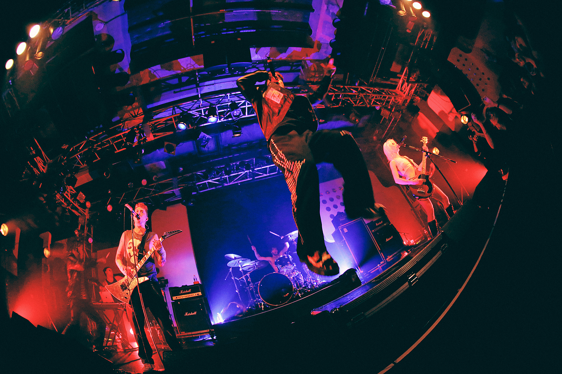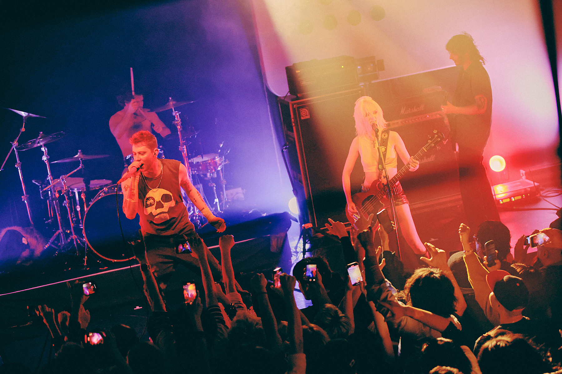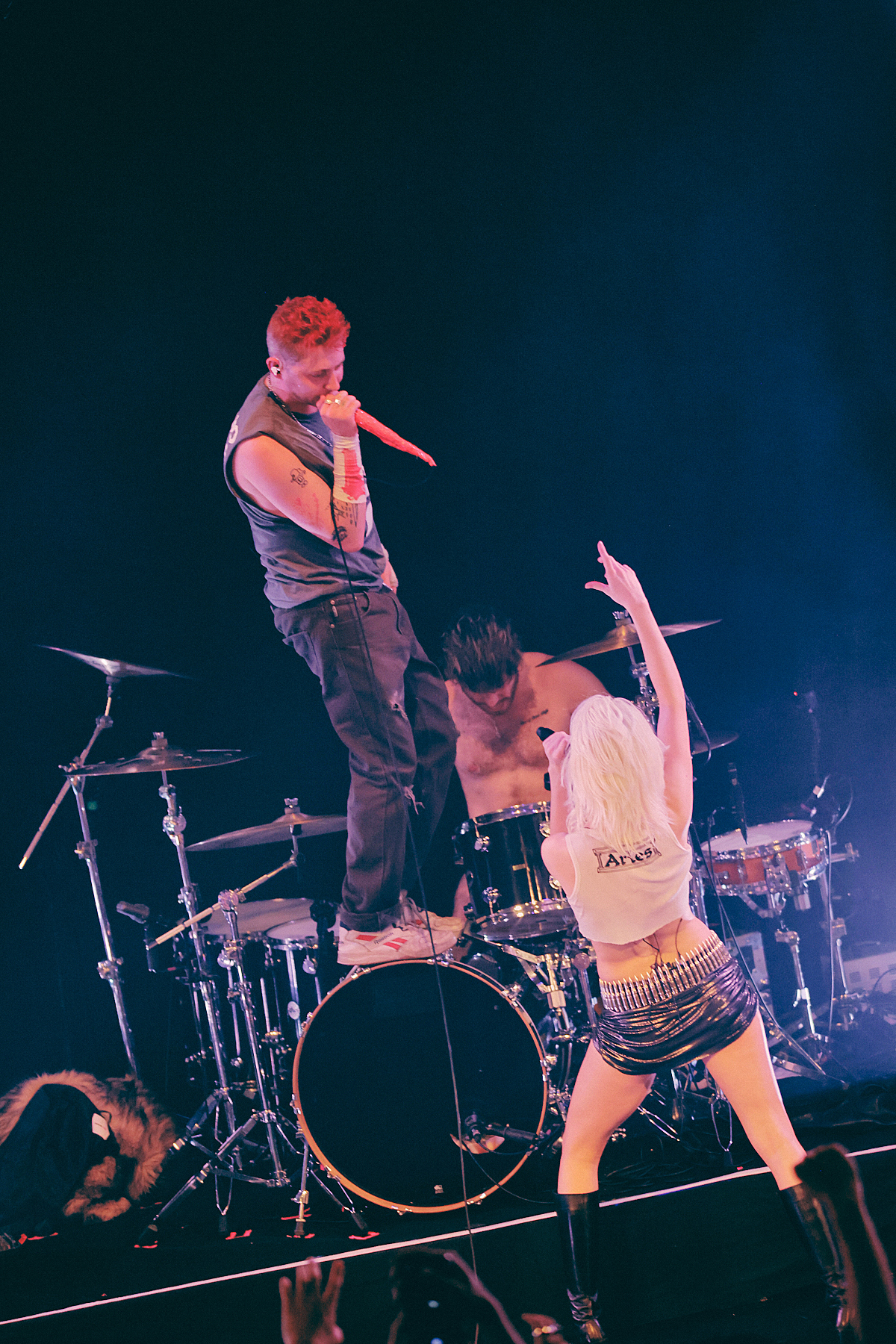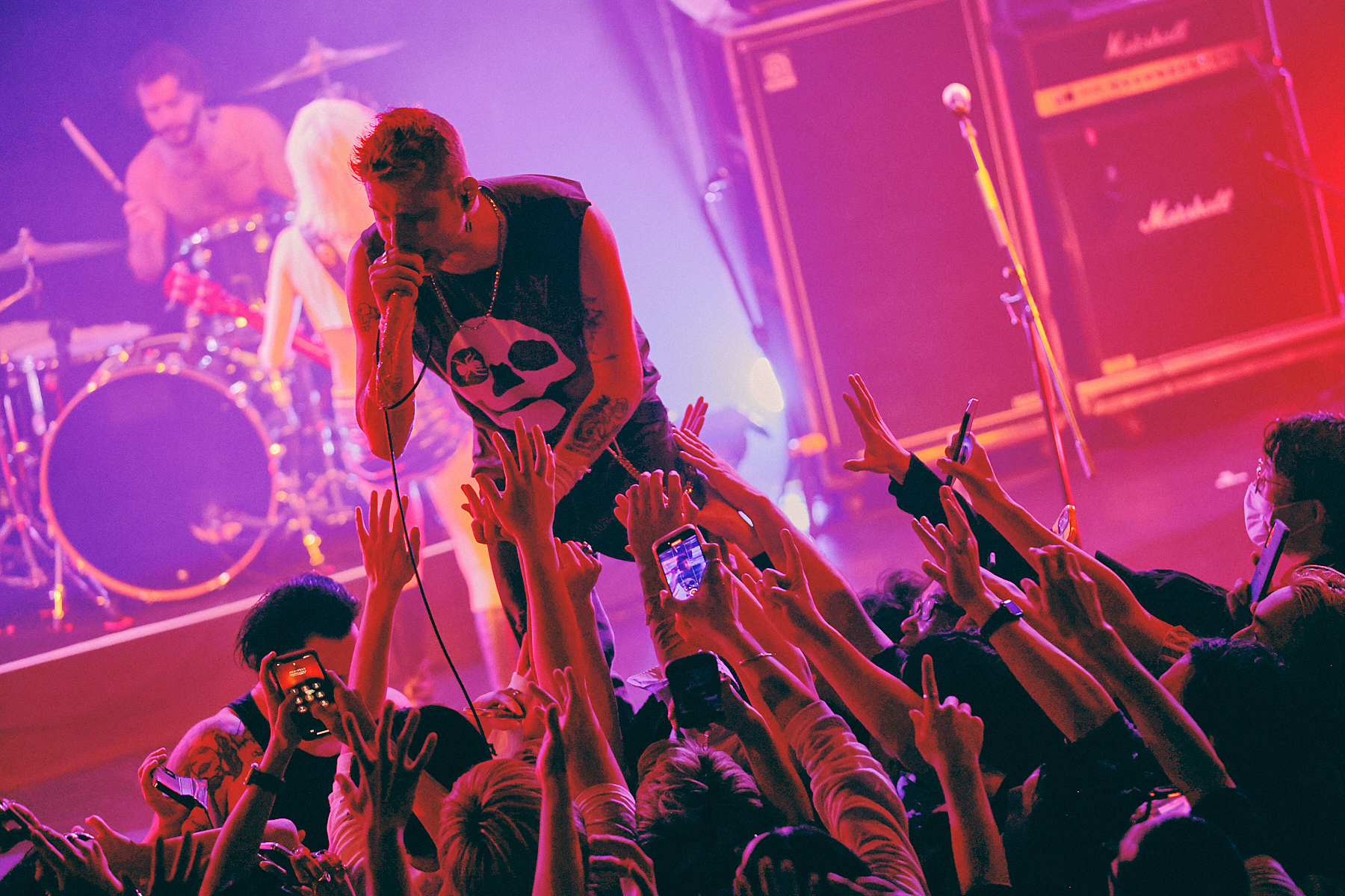 それまでハンドマイク片手に暴れまくっていたミルキー&マイクは、「Minigun」ではそれぞれベース&ギターを手にヘヴィ&グルーヴィーな音像を構築。その後、「Fukstar」ではミルキーのセクシーなメロウヴォーカルとサムの激情的スクリームを前に、より一層ヒートアップしたオーディエンスがフロアにモッシュの海を作り上げる。かと思えば、サムが「So happy to be here!」と日本でライヴをできる喜びを伝え、前のめりなファストチューン「S.A.D.」で会場はさらに熱を帯びていく。その流れを汲むように代表曲のひとつ「Pyro Pyro」へと傾れ込むも、イントロの途中でミルキーが演奏をストップさせる。フロアにはサークルピットが発生していたが、その大きさに不満なようで、観客にさらに巨大なサークルピットを求める。すると、オーディエンスも2人のリクエストに応えようとフロアいっぱいに大きなサークルができあがり、「Pyro Pyro」のイントロが再度鳴り響く。その光景を前に、ミルキーもサムもご機嫌な表情を浮かべる。