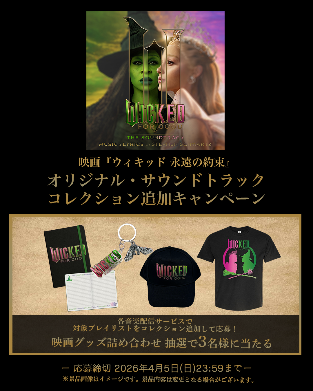 映画『ウィキッド 永遠の約束』のヒットを記念して、対象のプレイリストを音楽配信サービスでコレクション追加しXから応募した人の中から抽選で3名様に映画グッズ詰め合わせをプレゼント!たくさんのご応募お待ちしています。