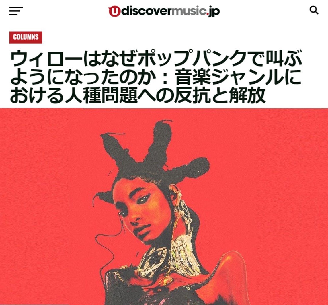 NEWS ALL TOPICS MEDIA LIVE/EVENT 2023.03.03 LIVE SUMMER SONIC 2023出演決定! 2022.10.07 TOPICS ニュー・アルバム『<COPINGMECHANISM>』配信開始! 2022.08.05 TOPICS ニュー・シングル「hover like a GODDESS」配信開始! 2022.06.24 TOPICS ニュー・シングル「<maybe> it’s my fault」配信開始! 2021.11.01 TOPICS 「Meet Me At Our Spot」のライヴ・バージョンが配信開始! 2021.10.22 MEDIA - WEB 【WEBメディア】 CINRAコラムにてピックアップ 2021.10.20 TOPICS アヴリル・ラヴィーンとのコラボ曲「G R O W」のミュージック・ビデオを公開 2021.09.30 MEDIA - MAGAZINE ウィローを紐解く記事がrockin’on 11月号に掲載! 2021.07.19 MEDIA - WEB 【解説】ウィローはなぜポップパンクで叫ぶようになったのか:音楽ジャンルにおける人種問題への反抗と解放 2021.07.16 TOPICS ニュー・アルバム『lately I feel EVERYTHING』配信開始! 1212