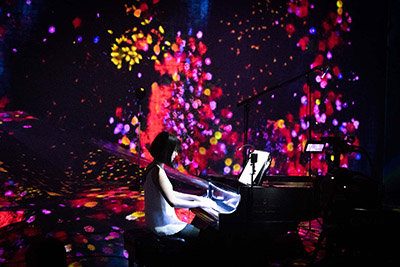 そしてドイツ・グラモフォンが誇る一流の演奏家であり、若手随一のテクニックと人気を誇るピアニスト、アリス=紗良・オットが登場。8月にリリースしたばかりのアルバム『ナイトフォール』から、ドビュッシーの「夢想」、サティの「グノシエンヌ第1番」、ドビュッシーの「月の光」を続けて演奏した。二度と同じ瞬間を観ることができない幻想的な空間と、アリスの美しく儚いピアノの音色で、会場はアルバム『ナイトフォール』のコンセプトでもある「逢魔が時」を思わせる特別な空間が現れた。最後の曲「月の光」の演奏が終了すると会場はしばし静寂に包まれた。その様子はまるで消え行く特別な空間を惜しむかのよう。