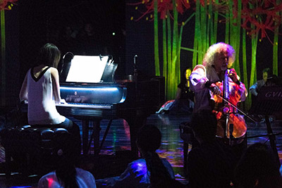 続けてスペシャル・ゲストとしてジャズ・ピアニストの山中千尋が、ベース、ドラムと共に登場。メドレー「Taxi-Gennarino suite」をトリオで演奏を開始すると、会場の空気は一転してディープな世界に様変わり。山中の奏でる軽やかなタッチと、ベース&ドラムの絶妙なセッションで聴衆を心地よい空気が包みこんだ。終盤「八木節」をモチーフにした快速テンポのメロディに移ると山中のピアノは一気に熱を帯び、そのまま一気にフィニッシュ。熱狂的な拍手が巻き起こった。