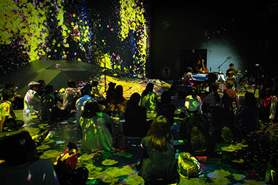 会場となった「森ビル デジタルアート ミュージアム:エプソン チームラボ ボーダレス」内にあるアート「人々のための岩に憑依する滝」には、販売開始からわずか9分で完売したチケットを手に入れたアート/音楽シーンに敏感な女性たちを中心に、さらにメディア関係者を含め約100名が会場に詰め掛けた。