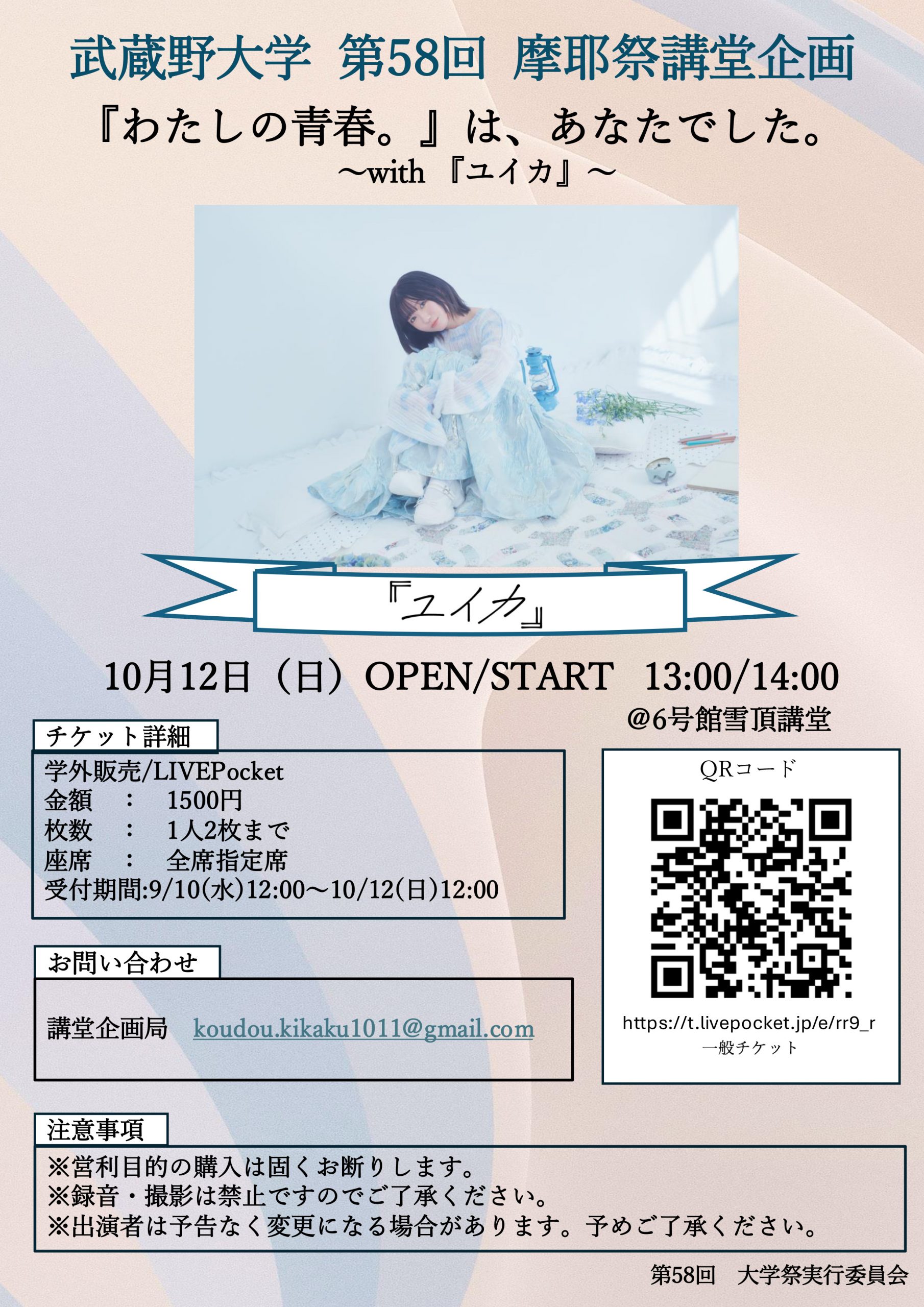 武蔵野大学 第58回 摩耶祭講堂企画「『わたしの青春。』は、あなたでした。~with 『ユイカ』~」」に、『ユイカ』の出演が決定しました!