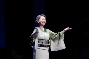 本人の声による場内アナウンスが流れた後、若草色の着物で歌い始めたのは「わたしのうた」。