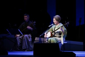 挨拶のMCに続き、「あさきゆめみし、水の月」を披露。会場内に由紀さおりの歌声が満ち満ちた。続いて、兄弟子である三味線奏者、本條秀英二氏を紹介。「ロサンゼルス生まれ、兄弟子なんだけれどずっとお若いのよ」と。「由紀さおりのチントンシャンソン」と題し、三味線の弾き唄いで都々逸を披露。5月のフランス公演に向けて半年ほどフランス語学校に通い発音を学んだというフランス語を交えながらの「ジュテーム♪」に観客はユーモアある形で純邦楽を楽しんでくれたようだ。