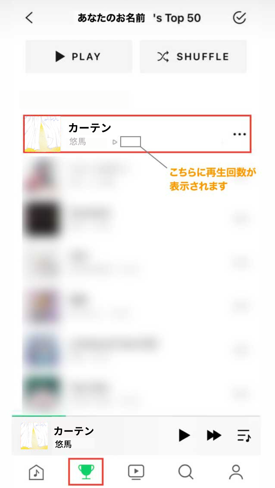 LINE MUSICランキングページの「(あなたのお名前)’s Play TOP 50」より、自分が何回再生しているか確認し、スクリーンショットを撮る。